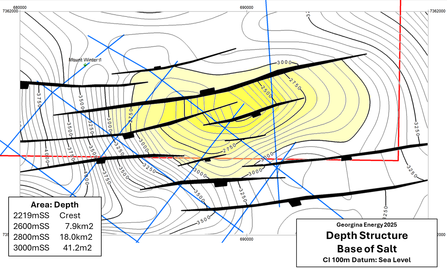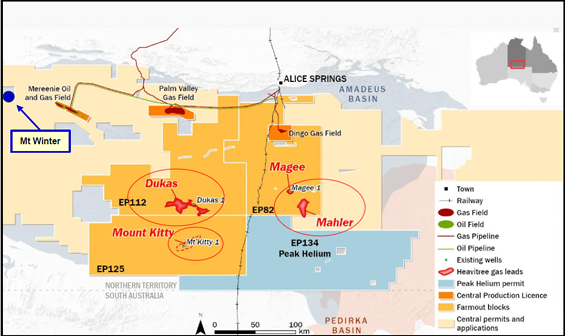 Georgina Energy plc is a UK-listed helium and hydrogen-focused energy company with a portfolio of onshore Australian assets targeting subsurface accumulations of helium, hydrogen and associated natural gas. Following the recent acquisition of interests in the Mt Kitty and Dukas projects, the Company has materially reshaped both the scale and risk profile of its asset base, transitioning from frontier exploration toward a re-entry and appraisal-led strategy. Near-term value is anchored by the Mt Kitty re-entry programme, with larger-scale upside at Dukas, which at over 1,000 km2/247,000 acres is probably the largest untested subsalt prospect in Australia, with Mt Winter and Hussar providing medium to longer-dated optionality. The Mt Winter project is in the same basin and targeting the same play (i.e. subsalt sandstones and fractured basement) as the Mt Kitty 1 and Magee 1 wells which successfully flowed gas to surface with phenomenally high levels of helium (up to 9%) and hydrogen (up to 11.5%) in the gas mix as well as up to 40% hydrocarbons.
