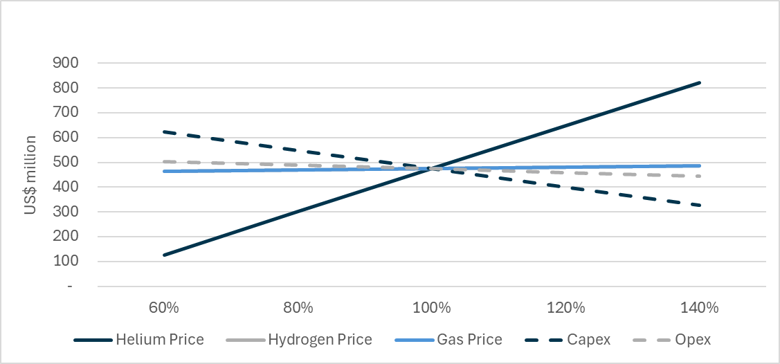 Wellhead gas pricing is contracted at US$4.00-$10.00/mcf depending on scenario, reflecting the value of the helium-hydrogen-hydrocarbon mix net of separation costs. This structure is consistent with the non-dilutive US$25 million offtake funding facility announced in January 2026 with Harlequin Energy Ltd, which contemplates similar commercial arrangements for the Hussar-2 well and potential Phase 1 development.