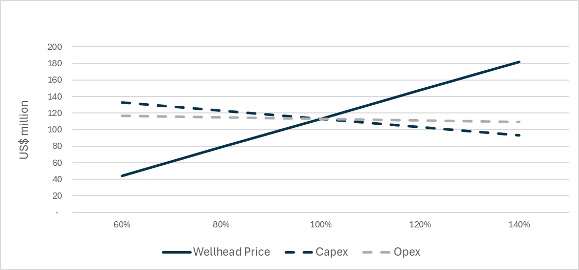 Wellhead pricing reflects the value split between field operator (Georgina) and plant operator (offtake partner), with three scenarios capturing the range of potential commercial outcomes: