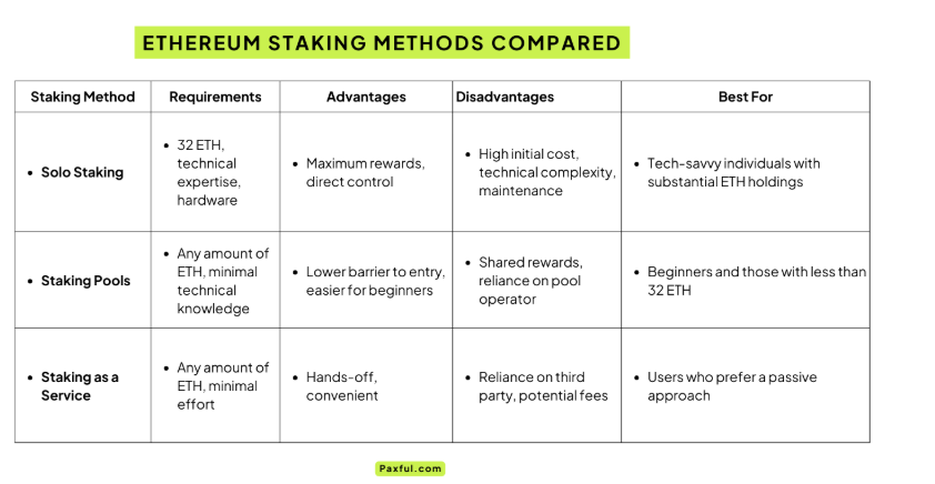 Home stakers can pool their funds with others, or go solo with at least 32 ETH. Liquid staking token solutions can be used to maintain access to DeFi.